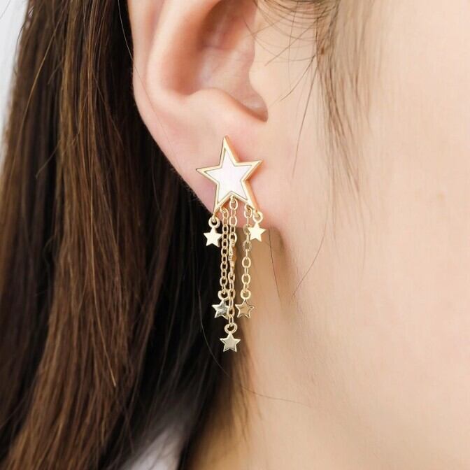 2つの異なったデザインの月と星モチーフのロングタッセルピアスのアシンメトリーピアス☆