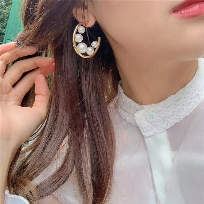 メタルラインのフープにパールを合わせて、女性らしさをプラスしたフェミニンなピアス☆